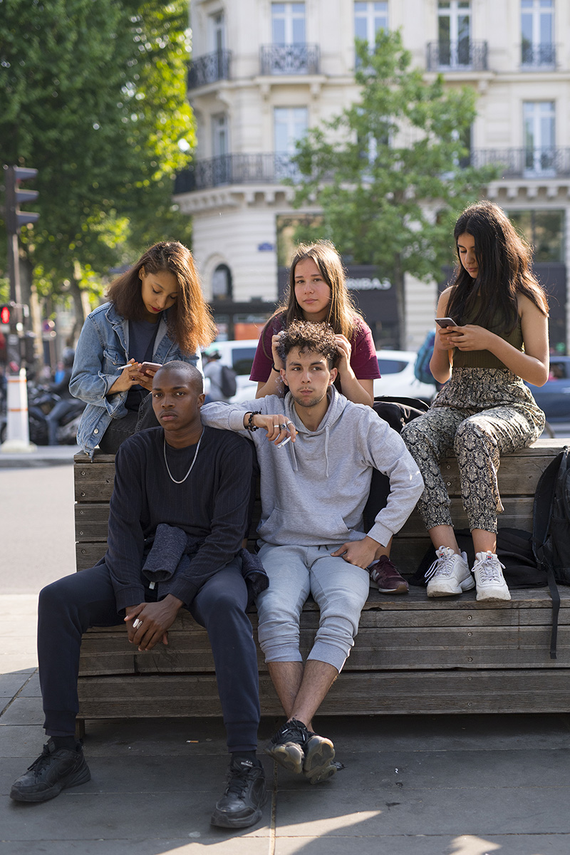 Quand je les ai vu, dans cette position, lui au centre, se faisant tripoter les cheveux par sa copine et leurs deux amies de chaque coté sur leur portable, je n’ai pas pu m’empêcher d’aller les voir. Le temps de m’éloigner pour cadrer ma photo, leur pote débarque et viens s’asseoir avec eux.