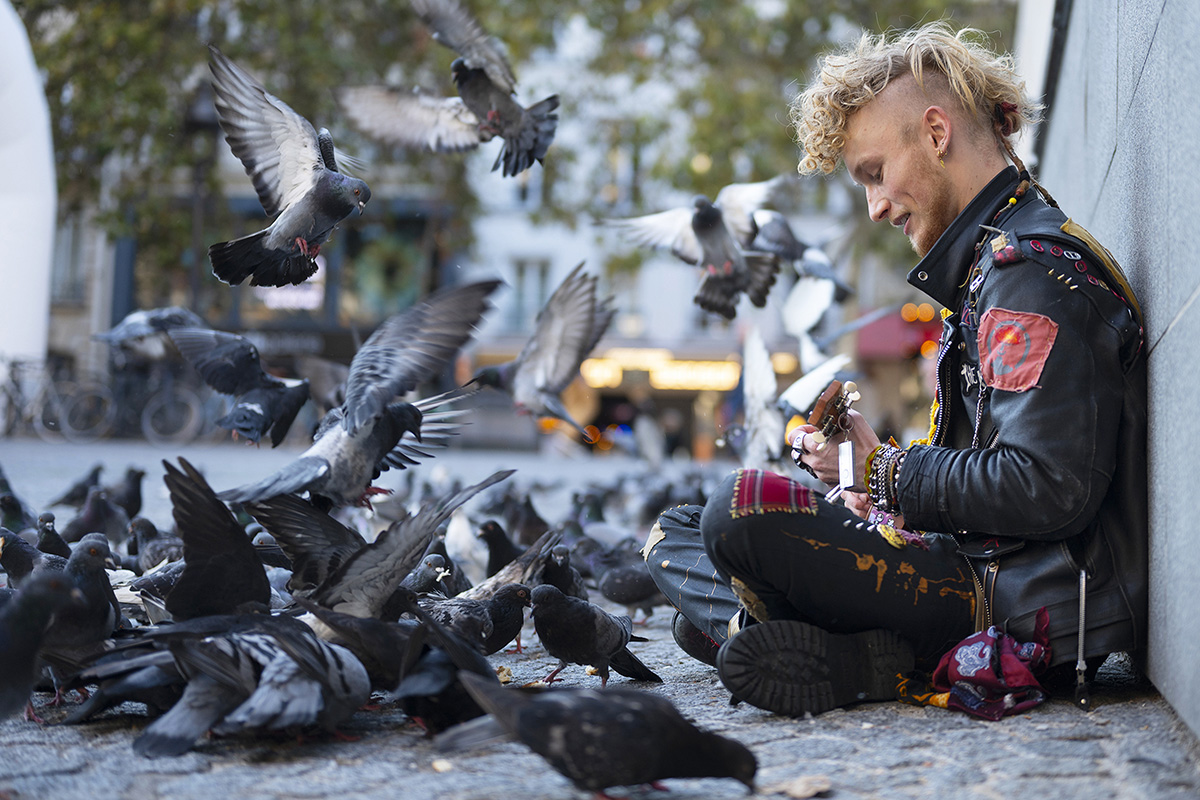Pigeons et ukulélé sur le parvis de Beaubourg